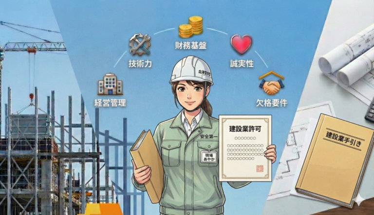 暴力団関係者でないこと、過去に法律違反がないこと。令和2年改正以降、社会保険の加入義務を遵守しているかが厳格に確認されます。